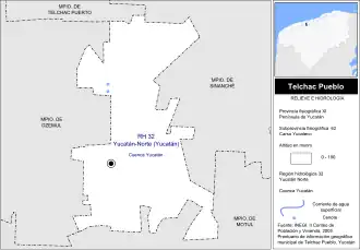 All over town there are no rivers due to high soil permeability,[4] this is a characteristic of the Yucatan area: water seeps into the ground where it forms underground rivers that form cenotes, which are outcrops to the surface of these subterranean river, in Telchac Pueblo there are 11 cenotes, 10 of which are open and a 1 semi-open.[5] The entire town is part of the Yucatan Basin belonging to the Northern Yucatan hydrological region.[6]