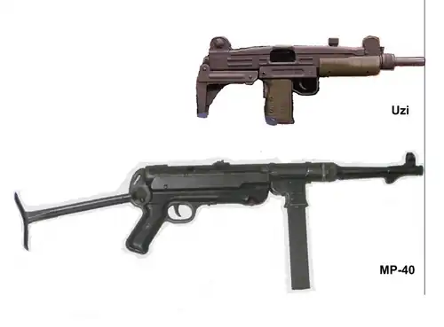 As the image diagrams demonstrate, the basic concept of a telescoping bolt with the magazine well in the handgrip produces significantly more compact weapons. These diagrams show the 1938 design (1939 service) MP-40 submachine gun, which is 630 mm (25 inch) long with the stock folded, weighing four kilograms (8.8 pounds) and having a 251 mm (9.9 inch) barrel, and the (similar materials and production technology) Uzi, a 1948 design (1951 adoption with 1954 service), which is 470 mm (19 inch) long with the stock folded, weighing 3.5 kilograms (7.7 pounds) and having a 260 mm (10.2 inch) barrel.