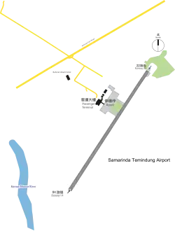 The airport was home to Samarinda's carrier Kaltim Airlines. Temindung is located on the north side of Karangmumus River in Sungai Pinang, Samarinda. There is only one runway in use, numbered 04/22 and oriented northeast–southwest (34/214 degrees true, 32/212 degrees magnetic). Near the southern end of the runway, a building rose up to nine stories.[1]