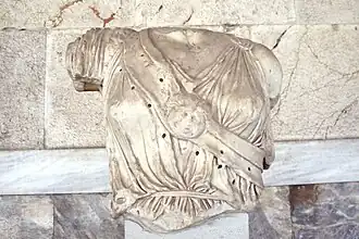 The Athena and Ares might have stood at the end of the cella as the main cult images of the sanctuary, perhaps flanked by the two images of Aphrodite mentioned by Pausanias.[126] These have been identified with two female torsos (inv. S 1882 and S 378) found in the post-Herulian wall with architectural fragments of the temple.[127][128] These statues are on the same scale and mirror each other, since the first rests her weight on her right foot, holds something (probably a sceptre) in her left hand, and leans left, while the latter rests her weight on her left foot, leans right and could have held a sceptre in her (lost) right hand.[129] The former is a classical statue from around 420 BC, probably made by "Master A", one of the sculptors who worked on the parapet of the Temple of Athena Nike.[130] The latter dates to the third century BC and is probably the statue of Aphrodite Hegemone from the Sanctuary of the People and the Graces.[125][131] In the Augustan context, the statue of Ares would have been linked with Augustus' patron Mars Ultor, the Athena with Minerva, and the two statues of Aphrodite with Venus as ancestor of Augustus' family, the Gens Julia.[24]