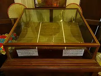 The first floor has historical records, lists of the Chief Prelates, lists of Kandyan Kings and the portrait busts, etc. The second floor has historical artifacts and religious items such as caskets, statues jewelries, etc. It has notable items such as silver water pot offered by king Kirti Sri Rajasimha, silver hanging lamp offered by king Rajadhi Rajasimha, painted replica of Buddha’s Foot Print sent by king Borom Kot of Thailand and unique Relic Casket containing bodily relics of the great Thera Moggliputta.[1] Also, the museum has dresses and garments of King Keerthi Sri Rajasinha including king's head cover, chest piece (Manthe), Karavaniya (cotton cloth wear over the trouser), cotton shirt, Saravale (trouser) and handkerchief.[2]