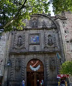 The Templo de San Francisco de Asís is a Catholic church in Guadalajara, Jalisco, Mexico. It is located adjacent to the Parque San Francisco at #295 Calle 16 de Septiembre in the central part of the city. The church was built by the Franciscans between 1668 and 1692, and stands on the site of an earlier Franciscan church and convent. Its exterior includes in its facade Solomonic columns which seem to spiral upward. The nave includes a baroque retablo above and behind the altar.