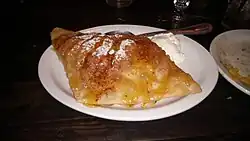 Sopapillas are a simple fried pastry dough sweetened with sugar and cinnamon.[13] The dish has roots in a lard-fried pastry made by the Tigua Pueblo and Franciscan friars from New Mexico in Ysleta, El Paso. This early form of the pastry dates to at least 1682, as the style originates in New Mexican cuisine, making it one of the earliest pastries known found in Texan cuisine.[12]