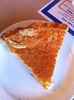 Pecan pie is the official state pie of Texas. The crust for another local specialty, peanut butter pie, is made with crushed vanilla wafers and peanuts. The filling is a sweetened peanut butter pudding made with milk, sugar, peanut butter, corn starch and egg yolks.[14]