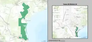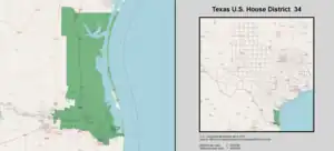 Texas's 34th congressional district is composed of the area on the Gulf Coast between Brownsville and Corpus Christi, the latter of which being situated in the neighboring 27th congressional district.[7] It extends westward to include the northeastern portion of McAllen and surrounds, with the rest of the McAllen area being in the 15th. In addition to the City of Brownsville, other major towns in the district include Alice, Beeville, Harlingen, Kingsville and San Benito.
