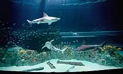 The 400,000 gal H-E-B Caribbean Sea exhibits sandbar sharks among a replica shipwreck.