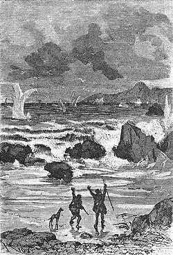 The cry is used by the protagonists of Jules Verne's The Adventures of Captain Hatteras (1864-1866) when they reach the Open Polar Sea after an arduous journey.[9] The cry is also mentioned by the narrator of Frederick Amadeus Malleson's (1877) translation of Verne's Journey to the Center of the Earth,[10] when the explorers in the story discover an underground ocean. It is absent from the original French work.[11]