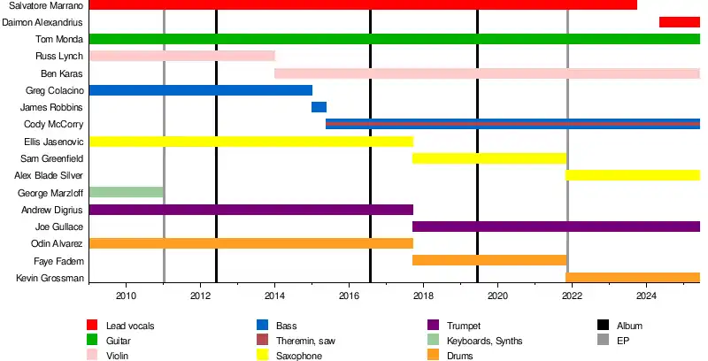In September 2023, the band announced on social media that the vocalist Salvator Marrano was leaving the band to focus on his family responsibilities. All scheduled performances were canceled.[16] In December 2024, it was announced that Daimon Alexandrius would be taking over on vocals.[17] The band is set to perform a small run of shows in May 2025 with support from Spilly Cave.[18]