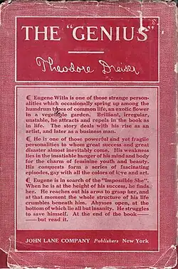 The "Genius" is a semi-autobiographical novel by Theodore Dreiser, first published in 1915. The story concerns Eugene Witla, a talented painter of strong sexual desires who grapples with his commitment to his art and the force of his erotic needs. The book sold 8,000 copies in the months immediately following publication but encountered legal difficulties when it was declared potentially obscene.[1] Dreiser's publisher was nervous about continuing publication and recalled the book from bookstores, and the novel did not receive broad distribution until 1923. When The "Genius" was reissued by a different publisher, the firm of Horace Liveright, it immediately sold more than 40,000 copies.[2]