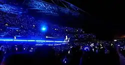 The concert begins with black-and-white projections of street scenes, which subsequently serves as the backdrop to the performance of "Welcome to New York".[17] Swift then emerges from beneath the stage to sing the song, followed by "New Romantics" surrounded by a dozen male dancers.[17][18] Next, Swift sings "Blank Space" before erupting into a call-and-response climax where she strikes a golf club against a black lacquer cane whilst also shouting the name of the city where the concert is being held.[19][20][21] Swift proceeds with an industrial rock-oriented version of "I Knew You Were Trouble", which she performs as shirtless male dancers delivered a sensual choreography.[19][20][22]