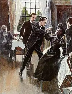 Holmes asking about a mark on the bureau, 1904 illustration by Sidney Paget