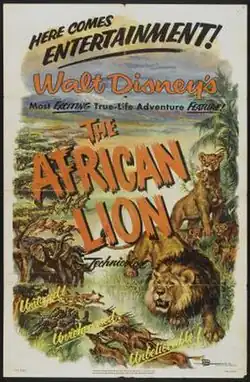 The African Lion is a 1955 American documentary film directed by James Algar. It was released by Walt Disney Productions as part of its True-Life Adventures series. The film, which was shot over a 30-month period in Kenya, Tanganyika and Uganda (as well as South Africa), focuses on the life of the lion within the complexity of the African ecosystem.[3] At the 6th Berlin International Film Festival it won the Silver Bear (Documentaries) award.[4]
