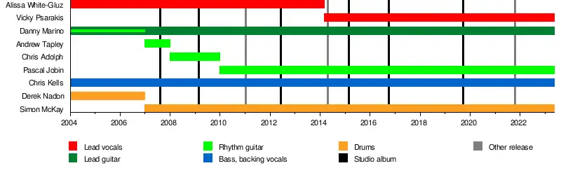 In March 2014, White-Gluz announced that she had been chosen as the replacement for Angela Gossow as frontwoman of the Swedish melodic death metal band Arch Enemy. She also revealed that the group knew it was "over" and that she and they had parted ways. Vicky Psarakis was then revealed as the new lead singer of the group. In April 2017, White-Gluz detailed the circumstances of her departure and how she considered it the "worst betrayal" she'd ever felt in her life.[28] The Agonist later released their own public statement disputing her account, citing unprofessional behavior and a lack of respect for fans and band mates as the reason for her departure, and that the band is "breathing a lot easier" in her absence.[29] Their fourth album, Eye of Providence, was released on February 23. The EP Disconnect Me was released in April. The album Five was released on September 30, 2016.