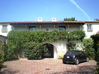 Architects Arthur and Nina Zwebell designed the structure around a richly landscaped interior courtyard.[3] Materials used reflected those commonly used in the Spanish Colonial Revival, Mediterranean Revival, Moorish Revival, and Mission Revival traditions: exposed wooden beams, cantilevered beams, carved wood, wrought iron, terracotta roof tiles, lightly textured buff-colored stucco, cast concrete, and brick.[4][5][6][7] Over the years, a cast of actors from the Golden Age of Hollywood lived at the Andalusia, including Sondra Locke, Clara Bow, Marlon Brando, Jean Hagen, John Payne, Teresa Wright, Louis L'Amour, Claire Bloom, and Cesar Romero.[2][8] Later, actor Jason Schwartzman occupied one of the units.[9] The building is located in a historic neighborhood south of Sunset Boulevard near the Chateau Marmont. The same block of Havenhurst Drive also includes two other apartment buildings listed on the National Register of Historic Places: the Colonial House (1416 Havenhurst Dr.) and the Ronda (1400–1414 Havenhurst Dr.).