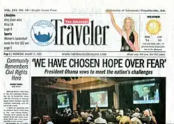 The Traveler is distributed free on campus and around the city of Fayetteville, Arkansas, and usually contains a mix of campus and local news coverage.