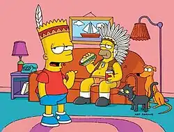 Marge subsequently establishes a peer group based on Native American life, called the "Pre-Teen Braves" — composed of Bart, Ralph Wiggum, Nelson Muntz, and Database, with herself as tribe leader after Homer fails in his leadership skills.[1]: 167–168  Later, when Marge takes the boys on a nature walk, they meet Joe Proudfoot of the Mohican tribe who shows them a field that is in need of cleaning up. The Pre-Teen Braves agree to the job, but discover that it has already been cleaned by another peer group, the "Cavalry Kids" — led by Milhouse's father, Kirk Van Houten, composed of Milhouse, Martin Prince, Jimbo Jones, and a nerd named Cosine.[1]: 169  The two groups try to outdo each other in doing good;[1]: 169–170  for example, when the Cavalry Kids bulldoze the house of the homeless from the Pre-Teen Braves and post a pre-fabricated in place, the Pre-Teen Braves retaliate by setting it on fire with arrows. When the Cavalry Kids sell candy in the hope of becoming batboys at a Springfield Isotopes game, the Pre-Teen Braves try to thwart them by lacing their candy with laxatives. Unfortunately for them, the senior citizens, in need of relief from constipation, buy the Cavalry Kids a win.