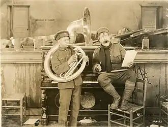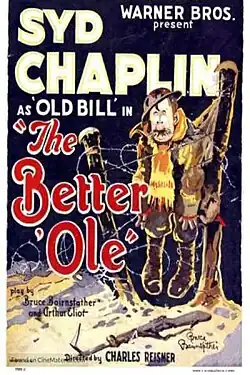 The Better 'Ole is a 1926 American synchronized sound World War I comedy drama film. Released by Warner Bros. Pictures, Inc., this film is the second full-length film to utilize the Vitaphone sound-on-disc process, two months after the first Vitaphone feature Don Juan; with no audible dialogue, the film does have a synchronized musical score and sound effects. This film was also the second onscreen adaptation of the 1917 musical The Better 'Ole by Bruce Bairnsfather and Arthur Elliot. Charlie Chaplin's eldest brother Sydney Chaplin played the main lead as Old Bill in perhaps his best-known film today. This film is also believed by many to have the first spoken word of dialog, "coffee", although there are those who disagree.[3] At one point during the film, Harold Goodwin's character whispers a word to Sydney Chaplin which is also faintly heard.[4] This was discovered by the UCLA's Robert Gitt, during the restoration of the sound discs for the film. The line was recorded in perfect sync, apparently during the orchestra recording sessions rather than live on set,[3] therefore making it the earliest known use of dubbing in a motion picture.