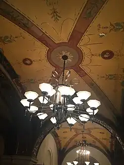 The interiors of the Biltmore Hotel are decorated with: frescos and murals; carved marble fountains and columns; massive wood-beamed ceilings; travertine and oak paneled walls; lead crystal chandeliers; cast bronze stairwells and doorways; fine artisan marquetry and mill work; and heavily embroidered imported tapestries and draperies. Most notable are the frescoed mural ceilings in the main Galleria and the Crystal Ballroom, which were hand painted in 1922 by Italian artist John B. Smeraldi, known for his work in the Vatican and the White House. Smeraldi and his team famously painted the ballroom's colorful, seamless fresco over a period of seven months, decorating it with figures of Greek and Roman gods, angels, cupids and other mythological creatures. It was meticulously restored in the 1980s by Smeraldi's apprentice, Anthony Heinsbergen. The imported Austrian crystal chandeliers that adorn it are 12 feet (3.7 m) in diameter.
