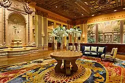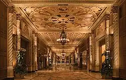 The hotel's original main lobby is today known as the Rendezvous Court, and is used for afternoon tea. It is decorated with a Moorish Revival styled plaster ceiling painted with 24 Carat Gold accents, two original imported Italian chandeliers from 1923, and a grand Spanish Baroque Revival bronze doorway, whose astrological clock still keeps time today. Two figures appear on the stairwell front—on the left is the Roman goddess of agriculture Ceres, while on the right is the Spanish explorer Vasco Núñez de Balboa. The current main lobby is located in the rear of the building, in the former Music Room, at the hotel's Grand Avenue entrance. It still has its original travertine walls and oak paneling, as well as the large artificial skylighted ceiling, reflected in the custom carpet below.