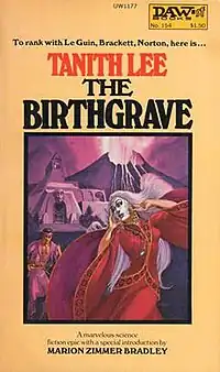 The Birthgrave was written by Tanith Lee around the age of 22; her mother typed the manuscript.[9] Much of the novel is based on Lee's own dreams where she was in the place of its narrator, which she describes as, ”we rose from fire and from death, fell deep into passions of love, raced the chariots…and withered and regained our destiny." When she first dreamed of the book's heroine, Lee described her as “white as ice, unknown to me as the back of the moon".[10] Lee usually doesn’t plan out her stories, often starting with creating the characters and “just writing” the story around their personalities.[8] The process of writing, Lee stated in a 2009 interview, usually takes about two weeks for her novels.[11] Tanith Lee's influences when writing mainly come from music, literature, film, and prominent public figures.[12] The Birthgrave was Lee's first adult novel, but was initially rejected by many publishers until it was picked up by DAW Books of America, launching her career[9] After reading fantasy novelist Jane Gaskell's “The Serpent” and noticing that she didn’t stick to the typical Real World setting, Lee was influenced to do just the same. She was also very fascinated by Gaskell's take on sexual romance and psychology and how she flowed the two different writing styles into one [14]. DAW was very interested in her story and chose to publish her, which turned out to be quite the success[15].
