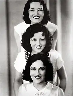 The Boswell Sisters were an American close harmony singing trio of the jazz and swing eras, consisting of three sisters: Martha Boswell (June 9, 1905 – July 2, 1958), Connie Boswell (later spelled "Connee", December 3, 1907 – October 11, 1976), and Helvetia "Vet" Boswell (May 20, 1911 – November 12, 1988). Hailing from uptown New Orleans, the group blended intricate harmonies and song arrangements featuring effects such as scat, instrumental imitation, ‘Boswellese’ gibberish, tempo and meter changes, major/minor juxtaposition, key changes, and incorporation of sections from other songs.[1] They attained national prominence in the United States in the 1930s during the twilight of the Jazz Age and the onset of the Great Depression.[2]