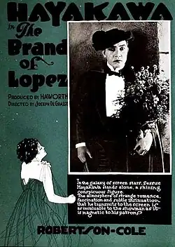 The Brand of Lopez is a 1920 American film directed by Joseph De Grasse and produced by Sessue Hayakawa's Haworth Pictures Corporation.[1][2][3][4][5][6] Although the main characters are a matador and an actress, there are no bull fighting or theater scenes portrayed in the film.