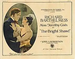 The Bright Shawl is a 1923 American silent historical drama film directed by John S. Robertson and produced by and starring Richard Barthelmess. This film, based on a novel by Joseph Hergesheimer, had several days of filming on location in Cuba. It features the first confirmed film appearance of Edward G. Robinson (credited as E.G. Robinson).