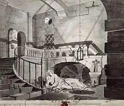 The sketch was one of at least three that Wright drew before making two similar paintings concerning the captured crusader. The sketches were sent to Peter Perez Burdett in Liverpool for his comment in the winter of 1772–73 before Wright created the smaller of the paintings, which was exhibited at the Society of Artists in 1773 with a version of The Blacksmith's Shop. Wright had hoped to sell a version of The Captive King to Markgraf Karl Friedrich in 1774. Friedrich was to eventually employ Burdett when he moved to Germany to avoid his debts – including money owed to Wright.[3] A larger version of the painting that was 40 inches by 50 inches was in the possession of Wright's son-in-law after it was sold in 1810. There is no report of it after that in Nicolson's book on Wright's work.[3] In 1774 and 1778 Wright created paintings with a similar subject of a man abandoned in prison, but the later paintings concern an extract from a contemporary novel. The last of these was Sterne's Captive, exhibited in 1778.[4]