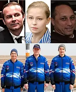 The crew members began training at the Yuri Gagarin Cosmonaut Training Center on 24 May.[20] To prepare for filming, Shipenko trained intensively, dropping 15 kilograms (33 lb) of weight.[14] On 23 July, the prime crew participated in a four-hour simulation inside a Soyuz replica while wearing the Sokol space suit,[21] and on 28 July, the back-up crew completed the same exercise. According to backup commander Artemyev, the performance of the two backup spaceflight participants was outstanding.