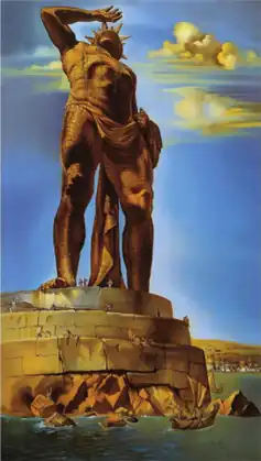 The painting shows the Colossus of Rhodes standing on a base of unworked ashlar.[31] The perspective is from below the statue's base, suggesting that the viewer is on a boat approaching the city, and emphasising the statue's extreme height and size.[32] A piece of drapery wraps around the waist of Helios and hangs from his left arm, falling down to touch the ground behind him.[14] Helios raises his right hand to shield his eyes from the sun over which he reigns, giving what the art historian Eric Shanes terms "a vaguely Surrealist touch" to Dalí's work.[32] In the lower right Dalí signed and dated the work "Salvador Dalí / 1954".[19]
