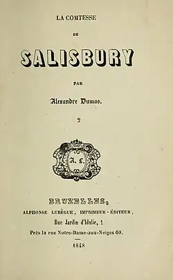 The Countess of Salisbury (French: La Comtesse de Salisbury) is an 1836 historical adventure novel by the French writer Alexandre Dumas. It was serialised in the newly founded La Presse newspaper between July and September 1836.[1] Dumas had been writing plays since the 1820s, but this marked his first serialised novel. In 1839 it was published as a three volume edition and a year later was published in an English translation.[2] Walter Scott was an influence on the author's writings, and he praises him in the preface of the 1839 edition in comparison to Genlis and Cottin.[3]