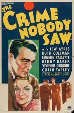 The Crime Nobody Saw is a 1937 American comedy film directed by Charles Barton and written by Bertram Millhauser. The film stars Lew Ayres, Ruth Coleman, Eugene Pallette, Benny Baker, Vivienne Osborne, Colin Tapley and Howard Hickman. The film was released on March 12, 1937, by Paramount Pictures.[1][2]