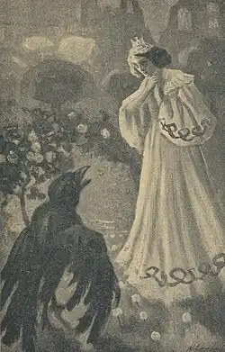 ![]() The princess meets the prince in crow form. Image from a 1922 publication. | |