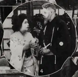 A short time later he is living in a Japanese fishing village and while devotedly loving his wife, he also has many sorrowful moments when thinking of his aged father whom he also loves tenderly. Kissomoia sees this sorrow of her husband. Kato receives a communication from his father telling him that the old man's days are numbered and requesting that he return and live with him during the declining days of his life. The letter also specifies that under no circumstances will the proud old father receive his wife into the house. Kato unwittingly drops the letter which is discovered by Kissmoia. She resolves to forever remove herself from the pathway of her husband whom she believes she is dragging down. She leaves, goes to the ocean and there commits suicide by leaping into it. After a bitter all night with himself, the love of Kato for his wife overcomes that for his father and he rushes into her room only to find that she has gone. He sees the note which she left and becomes frantic. A searching party is organized and Kato discovers the body of Kissmoia floating in the surf at nightfall. While the surf washes around him, and with the body of his dead wife clasped in his arms, he stares vacantly out to sea, and the picture dissolves with them in that position."