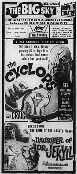 The Cyclops is a 1957 American science fiction horror film written, produced and directed by Bert I. Gordon, starring James Craig, Lon Chaney Jr. and Gloria Talbott. The theme of a monster created as a result of radioactivity was a common one in the 1950s.[2]