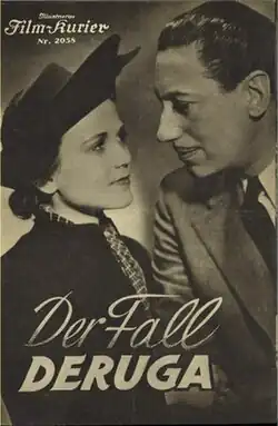 The Deruga Case (German: Der Fall Deruga) is a 1938 German crime drama film directed by Fritz Peter Buch and starring Willy Birgel, Geraldine Katt and Dagny Servaes.[1] It is based on the 1917 novel of the same title by Ricarda Huch. It was shot at the Babelsberg Studios in Potsdam.[2] The film's sets were designed by the art directors Wilhelm Depenau and Ludwig Reiber.
