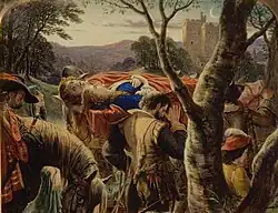 In some versions it is unclear who the nine (or other number of men) are; in others, they are brothers or are men sent by the lady's father.[2] In the ensuing fight, eight of the attackers are generally killed or wounded, but the ninth (often identified as the lady's brother, John or Douglas) fatally wounds the victim of the plot, usually by running him through with a sword and often by a cowardly blow, delivered from behind.
