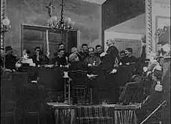 An ironworker with a strong resemblance to Dreyfus was hired for the role in order to increase the series's realism.[14] Méliès himself appears in the series as Dreyfus's attorney Fernand Labori and makes a brief reappearance as a journalist after Labori's attempted assassination.[15] At least one scene, Dreyfus's exit from the courthouse, appears to have been modelled on a news photograph printed in the journal L'Illustration.[16] Méliès drew on both cinematic and theatrical special effects for the series: the lightning in Landing of Dreyfus at Quiberon was added to the scene using multiple exposure, while the rain and rocking motion of the boat were created with stage machinery.[17] The gun smoke in The Attempt Against the Life of Maitre Labori is a puff of poudre de riz, a cosmetic powder.[18]