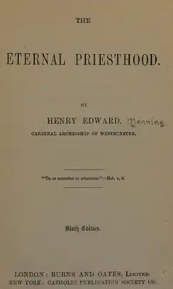 The Eternal Priesthood was Manning's most influential work, going through 19 editions by 1924, and was translated into most European languages—by S. A. M. Adshead's estimation, the book sold more copies at the time than any work by John Henry Newman except the Apologia Pro Vita Sua.[8] An anonymous academic reviewer in 1986 remarked that The Eternal Priesthood was "probably the only one [of Manning's works] that is now remembered".[9]