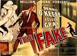 The Fake is a 1953 British crime mystery directed by Godfrey Grayson and starring Dennis O'Keefe and Coleen Gray.[1] An American detective tries to prevent the theft of a priceless painting from the Tate Gallery in London.[2]