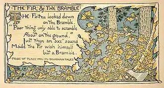 William Caxton (1484) was the first to provide an English version, taking the story from Avianus and giving it the title The busshe and the aubyer tree.[4] In John Ogilby's verse edition (1668) the fable is titled The Cedar and the Shrub[5] but most later collections give it as The Fir and the Bramble. In Victorian times the fable's moral was updated to "Better poverty without care, than riches with."[6]