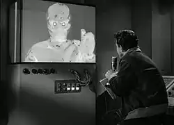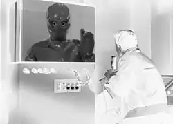 The shimmering effect of the alien was generated by filming a specially treated rubber suit through polarized lenses.[4] This photographic negative illustrates the effect used to create the appearance of the alien in the three-dimensional television transceiver.