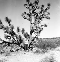 A woman, probably Maurine Whipple, poses with a giant Joshua tree.