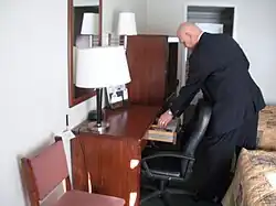 In addition to their well-known hotel room Bibles, members of The Gideons International also distribute Bibles to members of the military of various countries, to hospitals, nursing homes, prisons, MPs and students.[10]