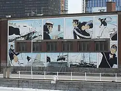 Part of a mural in Brussels dedicated to Corto Maltese. This section reproduces a panel sequence from The Golden House of Samarkand (originally printed in black and white) in which Corto manages to moor his boat off the Turkish coast, near Tarsus.