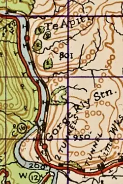The regions on either end of the Manawatū Gorge were farming regions, including dairy. In 1915 the Palmerston North branch of the New Zealand Farmers' Union investigated the possibility of utilising limestone deposits located in the hill above The Gorge station.[6][7] However, it would be another two decades before the plant was finally built by the Manawatu Gorge Lime Company.[8] To serve this traffic, in 1937 a new loop was installed next to the backshunt, 44 chains (890 m) towards Woodville. Limestone traffic continued for three decades before the rail facilities were reduced in 1962 and closed in about 1966.[5]