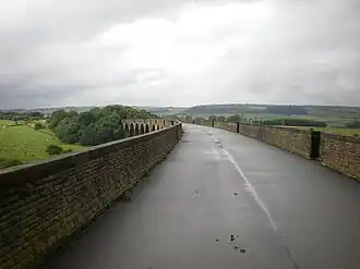 There are three viaducts on the route; Cullingworth,[11] Hewenden and Thornton.[12] Both Hewenden and Thornton viaducts are grade II listed structures[13][14] and Thornton is particularly noted for its S-shaped curvature and its views over the Pinch Beck valley.[15] A platform has been installed at Hewenden to allow for a greater views across the viaduct and westwards across Hewenden reservoir.[16]