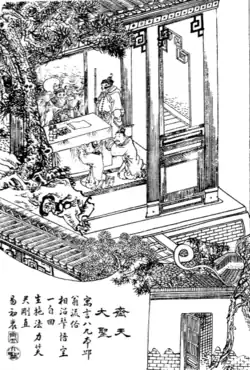 Sun Wukong first appeared in the 16th-century Chinese classical novel Journey to the West by Wu Cheng-en. In the novel he is also referred to as "Great Sage, Heaven's Equal" and "Handsome Monkey King".[1] Wu's character was well-received, to the point that some regarded him as a real god. During Pu's time, actual and genuine Sun Wukong shrines were already in existence or emerging, as part of "(t)he cult of this divine monkey". In a larger phenomenon, works of fiction contributed to the public's perception of or belief in deities. Hence, Meir Shahar, in his 1996 chapter on "Vernacular Fiction and the Transmission of Gods' Cults in Late Imperial China", opines that Pu Songling was criticising people's worship of a fictitious character.[2] The translation of the story, titled "The Great Sage, Heaven's Equal" by Sidney L. Sondergard, was released in 2014.[1]