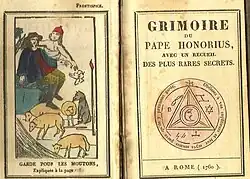 The Grimoire of Pope Honorius, or Le Grimoire du Pape Honorius, is a 17th to 18th century grimoire, which claims to have been written by Pope Honorius III (1150–1227). It is unique among grimoires in that it was specifically designed to be used by a priest, and some of the instructions include saying a Mass. While its name might be derived from the 13th century grimoire The Sworn Book of Honorius, its content is closer to later grimoires like the Key of Solomon and Grimorium Verum.