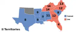 The results of the 1867 Confederate States presidential election in the novel. The Red denotes states won by Lee/Brown, blue denotes those won by Forrest/Wigfall while dark gray represents the non-voting Indian Territory